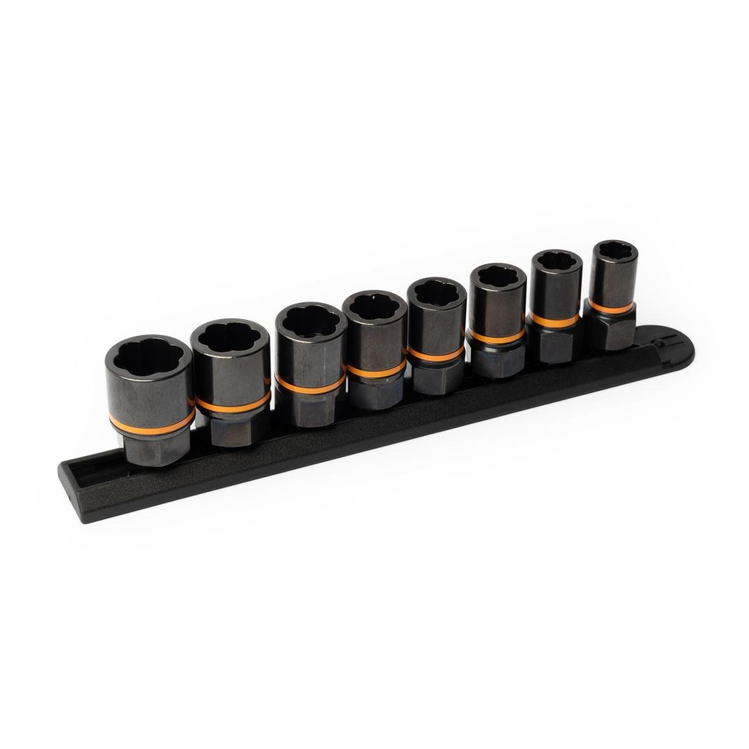 Struggling with a rusted, rounded, or stripped screw head? The new SATA BoltBiter fastener extraction tool sets (13/23 pieces) are the solution. Thanks to their unique fastener gripping technology and bi-directional design SATA BoltBiter fastener extraction tools reliably remove stubborn nuts without damaging sockets and workpiece. The ability to re-use a damaged fastener makes the BoltBiter the perfect tool for specialized components. Innovative tapered flute openings allow the socket to easily connect with the fastener, eliminating the need for a striking tool and reducing jamming in the socket compared to traditional extraction. Minus-sized sockets fit a wide range of damaged fasteners. Both sets contain a ratchet with flush mounted reversing lever that allows users to change direction onehandedly without removing the wrench.